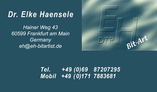 EH ...your bit-artist Dr. Elke Haensele Hainer Weg 43 60599 Frankfurt Germany Tel. +49 (0)69 87207295 Mobil +49 (0)171 7883681